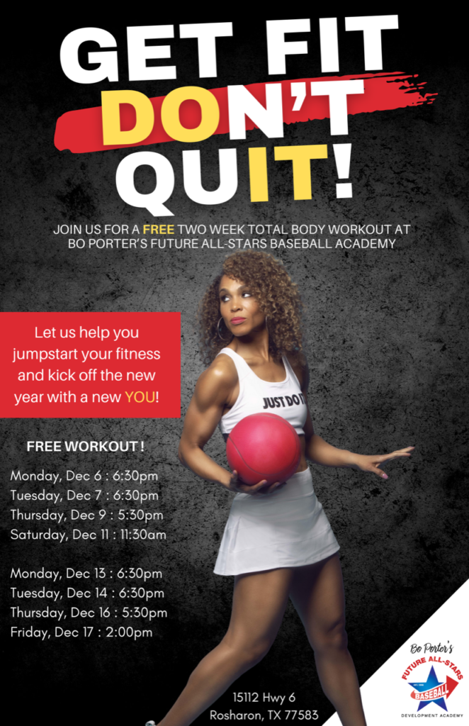FREE Fitness Training Please complete the following: Your Name* Your Email* Gender* malefemale Age* Cell Phone* Which classes will you attend? Check all that apply: Monday, December 6th, 6:30pmTuesday, December 7th, 6:30pmThursday, December 9th, 5:30pmSaturday, December 11th, 11:30pmMonday, December 13th, 6:30pmTuesday, December 14th, 6:30pmThursday, December 16th, 5:30pmFriday, December 17th, 2:00pm What type of workouts are you interested? Check all that apply: Total BodyLower BodyUpper BodyHigh ImpactLow ImpactCardioStretching & FlexibilityCore & MobilitySpeed & Agility I hereby authorize Future All-Stars Sports Development Academy to act for me in judgment in any emergency requiring medical attention. I hereby waive, release and indemnify Future All-Stars Sports Development Academy, it’s consultants, employees and Bo Porter of all legal responsibilities in the event of injury. I know of no mental or physical problems, which might affect my ability to safely participate in this program. I will be responsible for any medical charges in connection with my attendance of the program before, during or while leaving any activity. Please list any health or medical problems. I hereby give my full permission for the use of my name, picture, image, video, likeness, actions, voice, or other personally identifiable information, in whole or in part, individually or in conjunction with other images, captured by any means as part of my participation in any Future All-Stars Sports Development Academy and/or an affiliate sponsored event. I waive all rights of privacy or compensation, which I may have in connection with such use of my name, picture, image, video, likeness, actions, voice or other personally identifiable information, to be used by Future All-Stars Sports Development Academy and/or its affiliates and/or sponsors for promotional purposes in any media whatsoever.